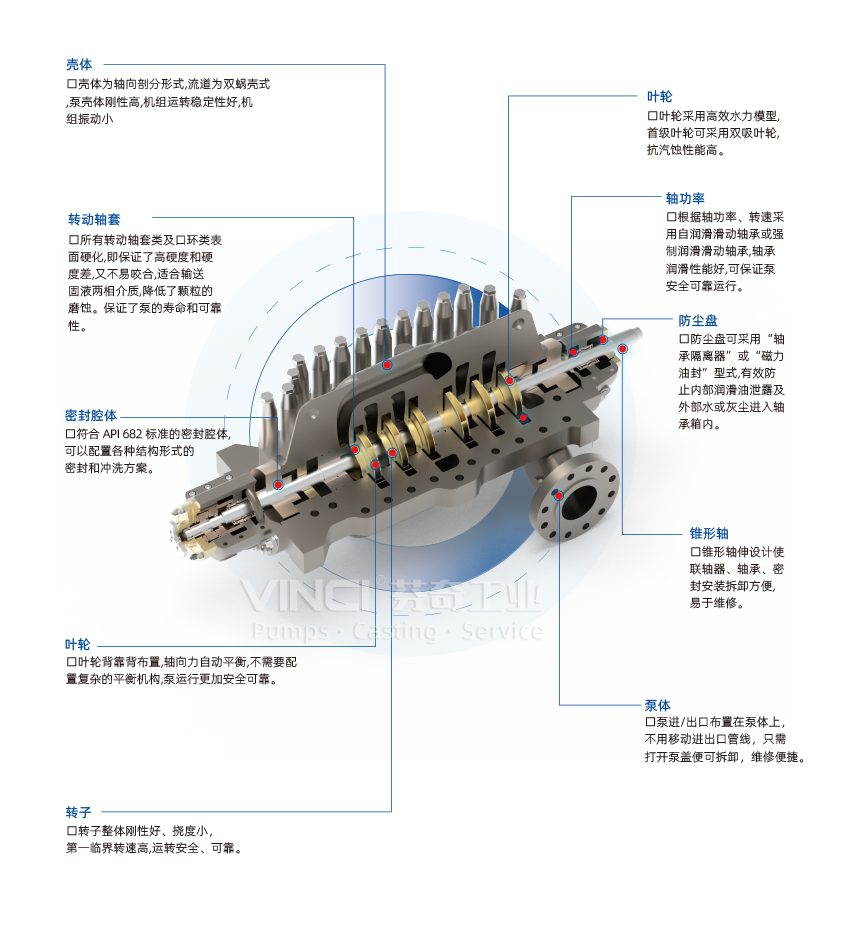 VBBS - C 系列泵是符合API 610 標(biāo)準(zhǔn)的 BB3 型式離心泵。泵體為蝸殼式蝸形體結(jié)構(gòu),中心線支承,葉輪采用對(duì)稱布置,軸向力自動(dòng)平衡,沒(méi)有復(fù)雜的平衡機(jī)構(gòu);進(jìn)口和出口布置在殼體的下面,在不移動(dòng)進(jìn)出口管線情況下,可拆卸和安裝泵蓋,便于檢修和更換葉輪,泵軸、級(jí)間襯套等零部件。首級(jí)葉輪可設(shè)計(jì)成單吸或雙吸兩種結(jié)構(gòu)。