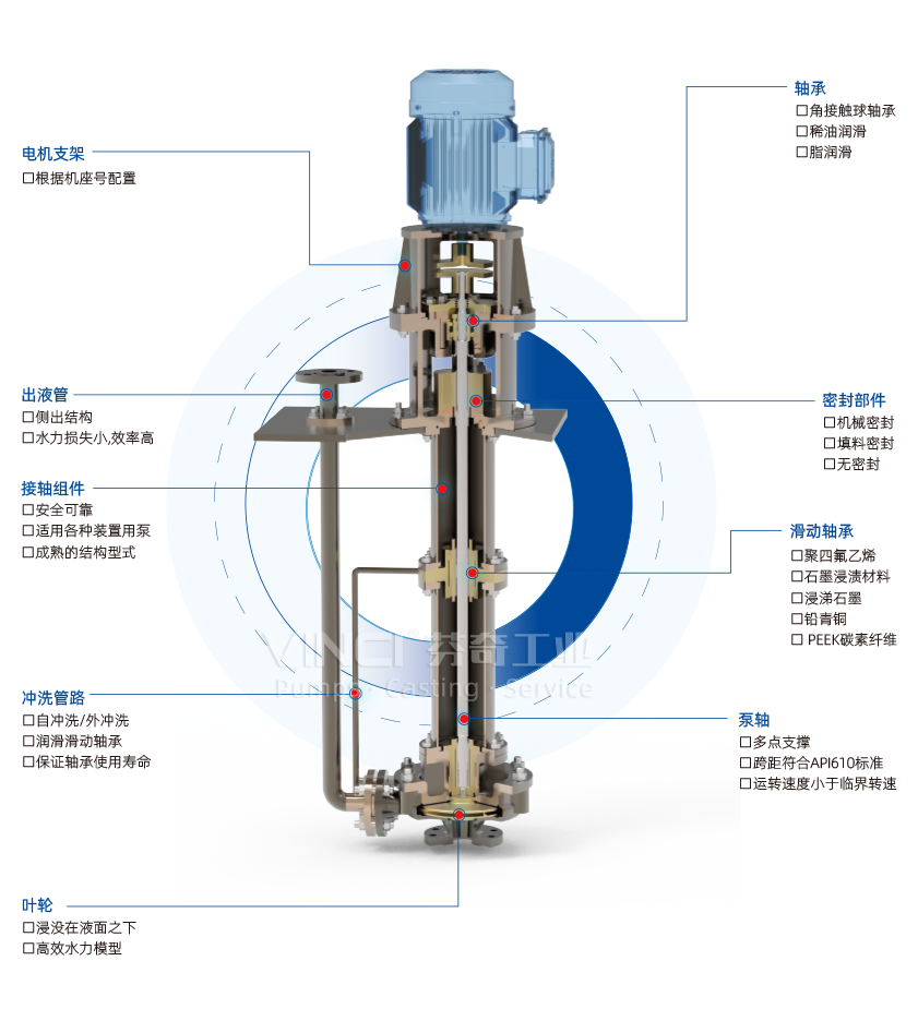 VSY-D系列立式液下泵按照美國石油學會AP1610 11th規(guī)范設計。VSY-D系列泵為單級、單吸、單蝸殼、徑向剖分的長軸液下泵,泵軸由在泵體和滑動軸承體內(nèi)的滑動軸承支承。軸承及軸的制造依據(jù)標準組件的設計原則,能夠用于多種水力設計,通用性較強。液下插入深度可達5.5m。